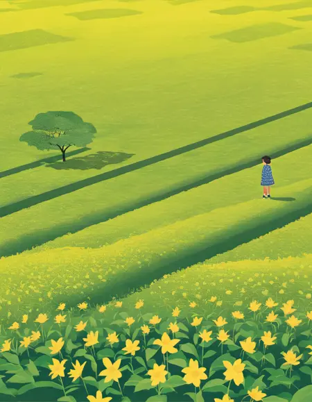an illustration of a car driving down a road in a field of yellow flowers in the style of ryo-takemasa