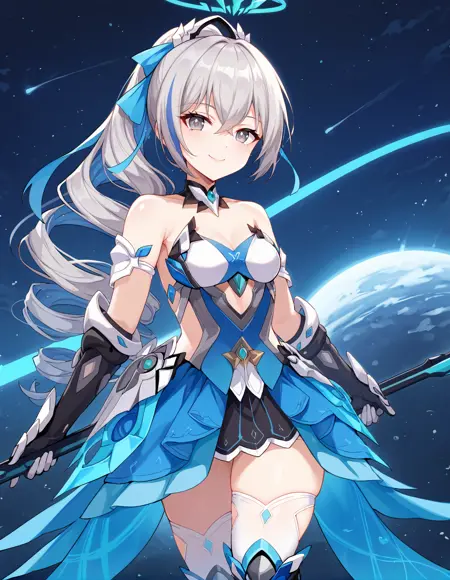 トリガー語: herrscher_of_truth, ハロー, 灰色の髪, 灰色の瞳, 赤い虹彩, 肩を出す, ドレス, ブーツ, グローブ, 眉間の髪, 前髪, ポニーテール, アーマー, 髪飾り, 白い太ももまでのハイソックス, アーマードブーツ, 膝上ブーツ