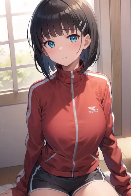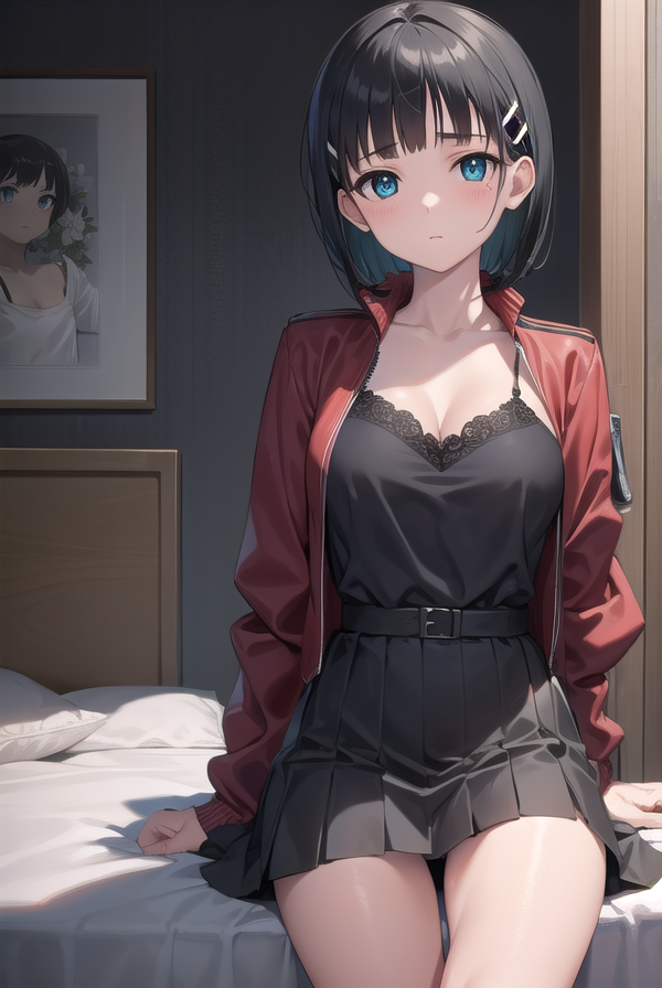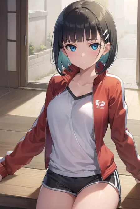 Casual: black shirt, black tank top, blouse, cleavage, collarbone, denim, denim shorts, jacket, long sleeves, open clothes, open jacket, partially unzipped, red jacket, shirt, short shorts, shorts, tank top, track jacket, unzipped,