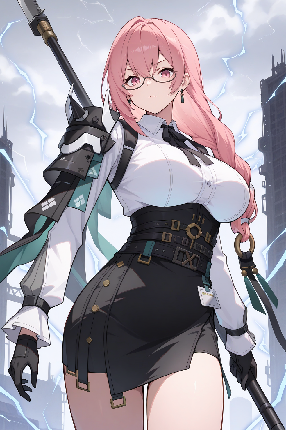 의상 1: 어깨 갑옷, 검은 목 리본, 흰색 드레스 셔츠, 프릴 소매, 검은 손목 벨트, 허리 벨트, 검은 벨트, 아랫가슴, 고 허리 스커트, 검은 스커트, 아이디 카드, 검은 장갑
