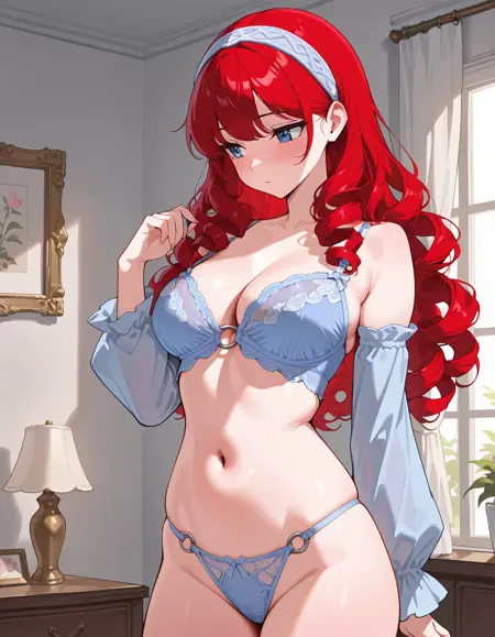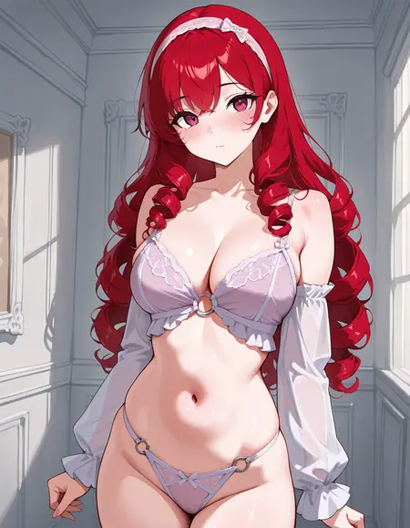 hud_prplset, 1girl, solo, underwear, panties, lingerie, bra, detached sleeves, navel, breasts, o-ring, hairband,