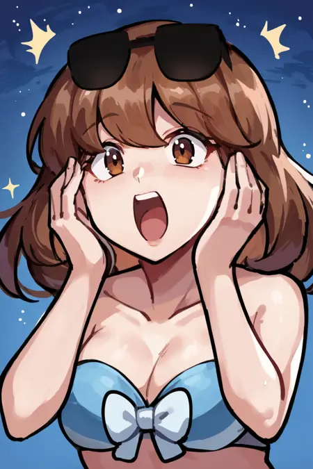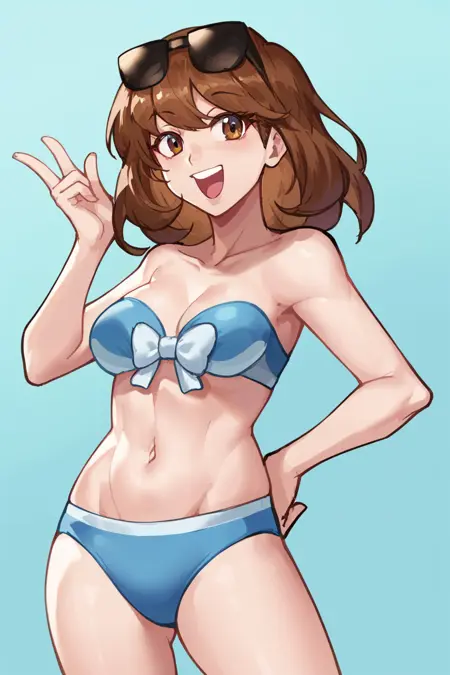 키워드는 orassw1mmer이며, 다음을 사용하세요: 머리에 선글라스, 갈색 머리, 파란 비키니, 스트랩 없는, 활