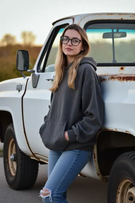 This is the last one from the poses series - leaning back, but standing. Also a classic in portrait photography. There is not much variation in the dataset, most are three-quarter angle or side angle shots - for front angle shots, you can't really see the leaning part. It is also a mix from full-body to half-body portraits. And in most cases, one leg ist lifted up. The prompting is simple: "standing" and then "leaning back against ...". For consistency, use the LoRA-tag lora:LeaningBackStanding-60:1.