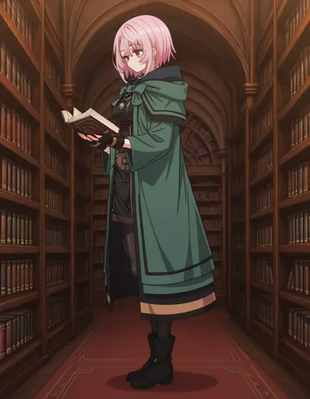 green robe, black dress, bowtie, necklace, long sleeves, fingerless gloves, waist pouch, pantyhose, boots