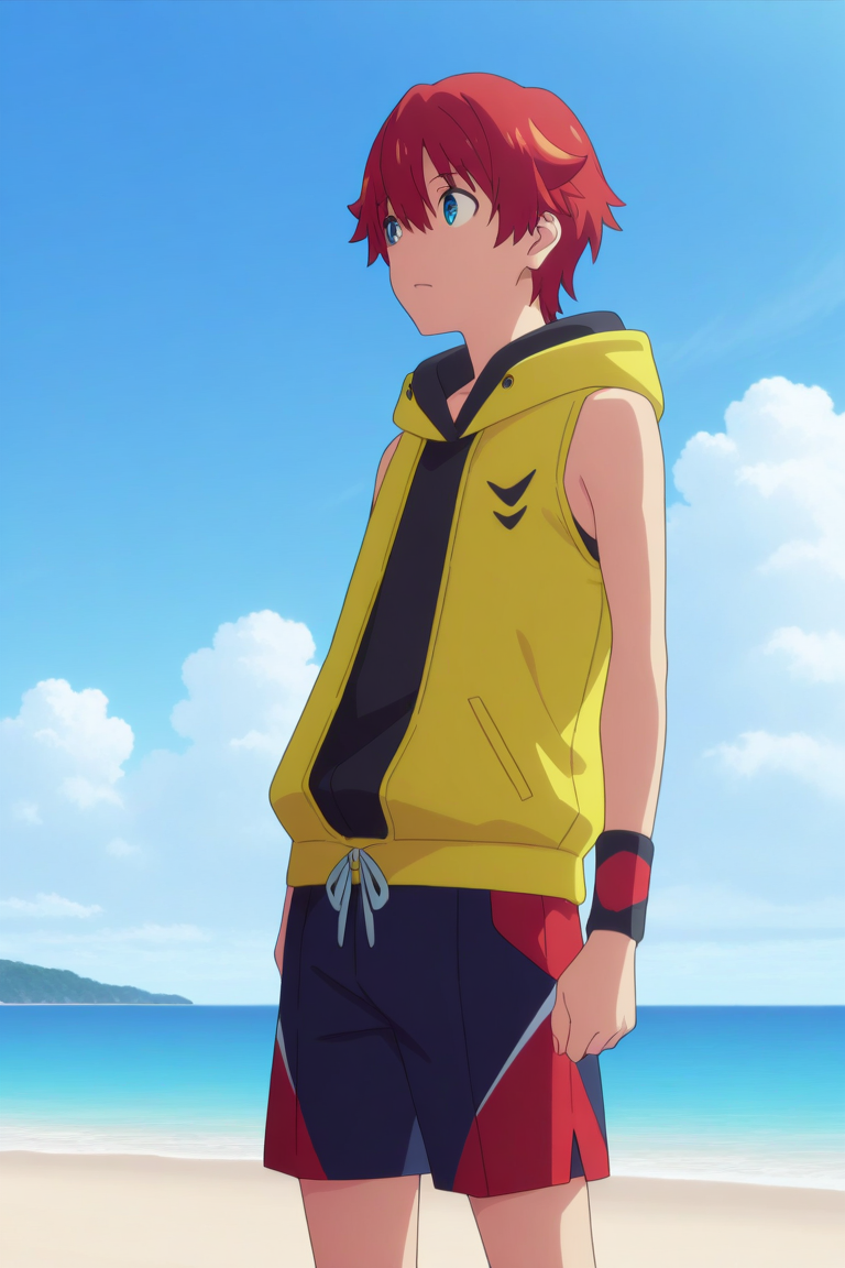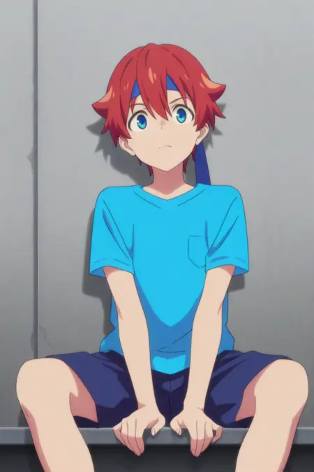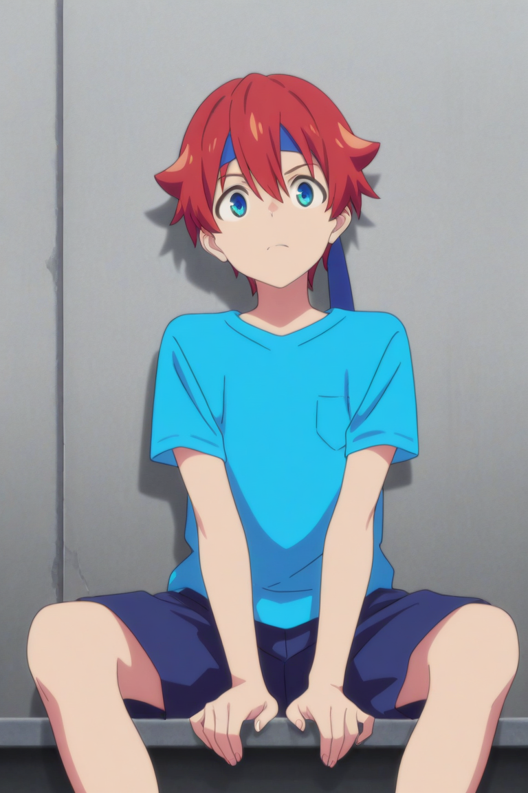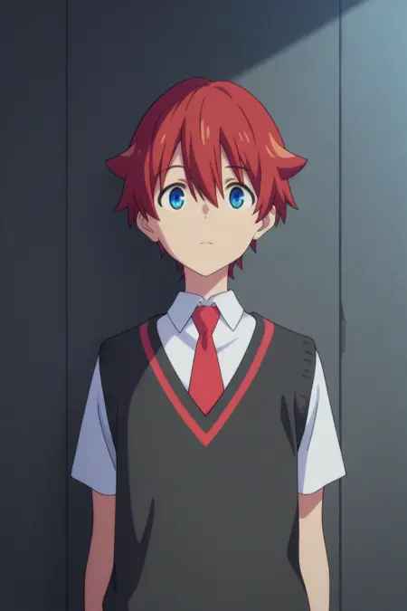 yuta hibiki, blue eyes, red hair,