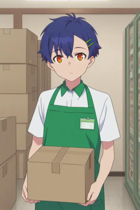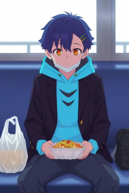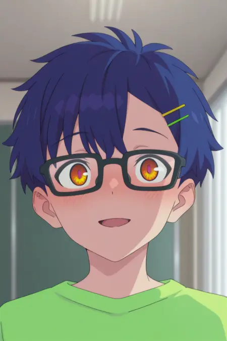 yomogi asanaka, blue hair, orange eyes,