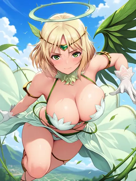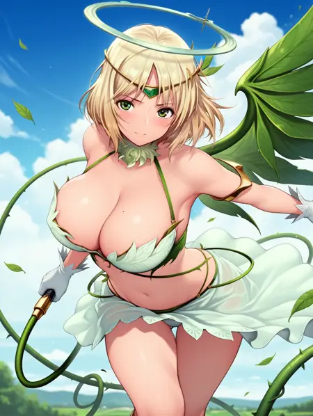 加布里埃拉,金发,短发,绿眼,光环,树叶,大乳房,内衣,王冠,珠宝,白色手套,臂环,裙子,胸脯,一只翅膀,树叶翅膀,