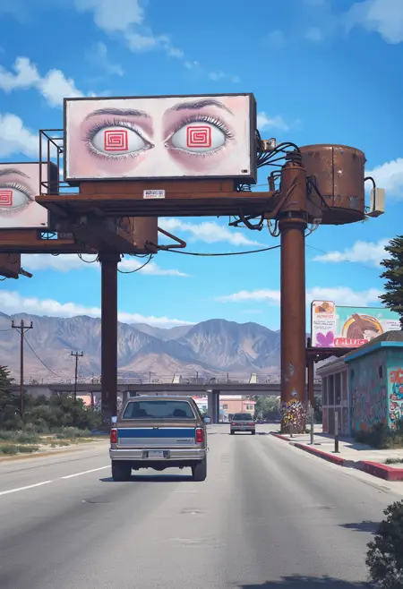 The LoRA has a moody effect on landscape prompts such as that of fields, roads, rural and urban subjects.