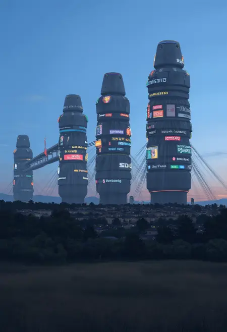 The image is a digital illustration depicting a futuristic, alien landscape. The scene features a winding, narrow road that cuts through a lush, green landscape. The road is bordered by tall grasses and small wildflowers. In the background, three large, cylindrical structures stand tall, connected by glowing red beams. These structures are reminiscent of alien spacecrafts, with glowing red lights and sleek, metallic textures. The structures are positioned on rolling hills, with the middle structure slightly taller than the others. The foreground features a small house with a red roof, and a few smaller structures, possibly barns or sheds. The background is dominated by a dense forest of green trees and shrubs. The sky is a muted blue, with a slight haze, indicating a cloudy day. The overall color palette is dominated by blues and greens, with the red lights adding a striking contrast. The illustration has a surreal, sci-fi aesthetic, with a focus on futuristic technology and alien design. The texture is smooth, with a slight graininess that adds depth and realism. The overall mood is serene, with a hint of mystery and intrigue.