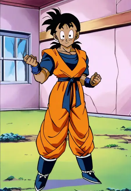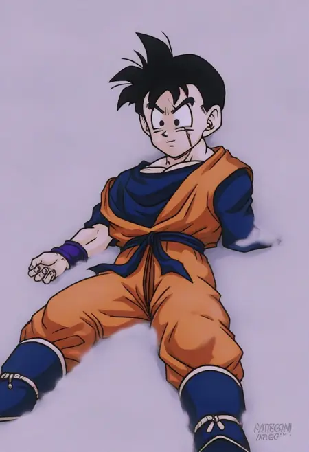 BMGohan,black hair, black eyes, short hair, orange sleevelees dougi, Blue Tshirt under dougi, wristband, orange pants, blue footwear, boots, blue sash,