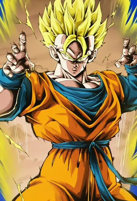 SSMGohan,orange sleevelees dougi, Blue Tshirt under dougi,wristband ,spiked hair, muscular,spikey yellow hair, blue eyes, super saiyan, orange pants, blue footwear, boots,blue sash,