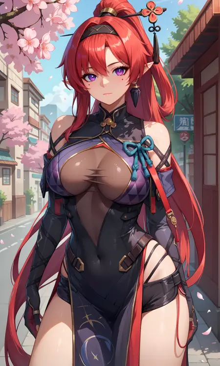 yinlin,紫色眼睛,尖耳朵,红发,异常长发,高马尾,发带,发簪,流苏,耳环,痣,眼下痣,katsuyamamage