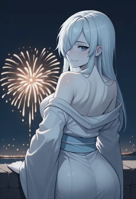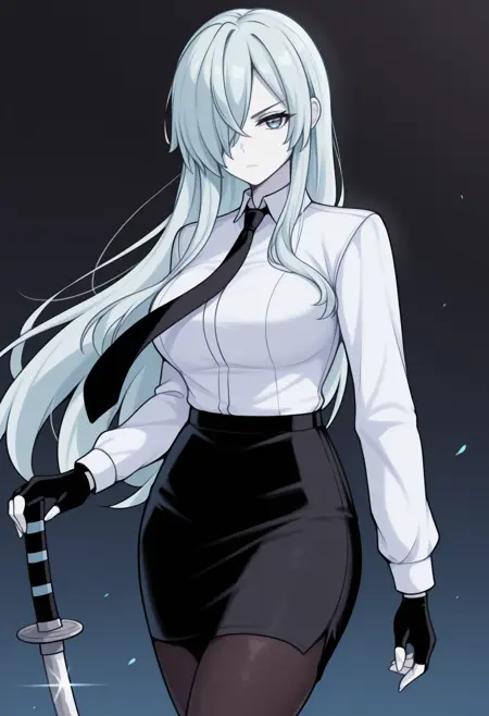 触发词 + 外貌: ull96, 白色皮肤, 长发, 白发, 发丝遮住一只眼睛, 蓝眼睛, 大胸部