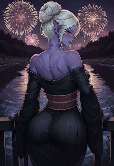 "色のある肌、紫の肌、尖った耳、赤い目、髪の結び目、短い髪、白い髪、首のタトゥー、中程度の胸"