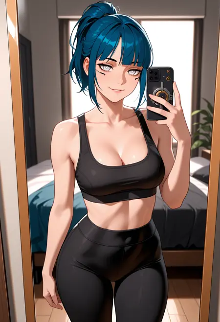 KJOblue, 青い髪, 白い目, 黒い瞳, 環状の目, 黒い眉, 機械的な顔のマーク, アンドロイド,