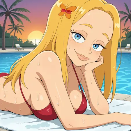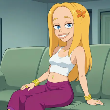 触发词:1girl, Solo, Leah_BM, 白皙皮肤, 蓝眼睛, 金色眉毛, 金发, 长发, 蝴蝶发夹, 粉色嘴唇, 白色无袖短上衣, 长裙颜色鲜艳的紫罗兰色, 粉色凉鞋, 金色项链, 金色肚脐环, 三个金色手镯, 金色戒指