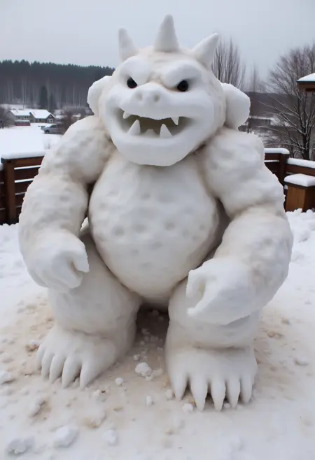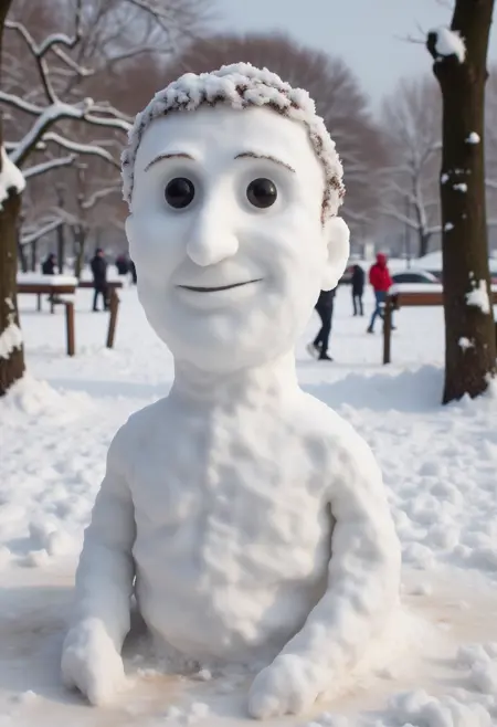 - リアルな写真:**(サブジェクト)**という雪の彫刻。すべて雪で作られており、表面の質感は不均一で、一部はしっかりと圧縮され、他の部分はふわふわしている。これは素人が手で形作った雪の芸術作品によく見られる特徴である。