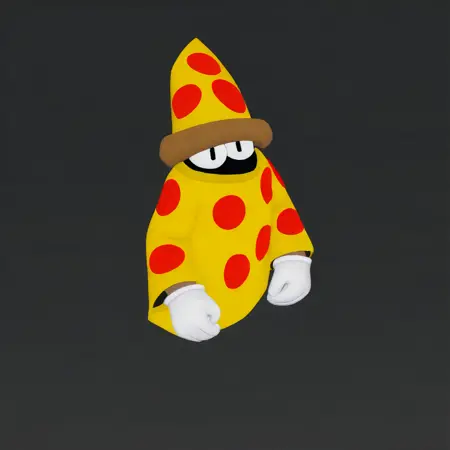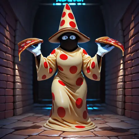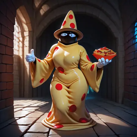 Tags: pizzard, solo, full body, hat, polka dot, black eyes, black skin, robe, long sleeves, white gloves, fewer digits