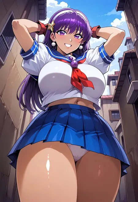 | 학습된 단어 | Long hair,purple hair,purple eyes,복사됨! white socks,short socks,black shoes,복사됨! clothes lift ,shirt lift ,School uniform, serafuku, hair band, star hair ornament,star (symbol),blue sailor collar, white shirt, short sleeves, blue pleated skirt, short skirt,red fingerles gloves복사됨! |
