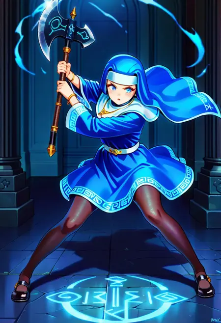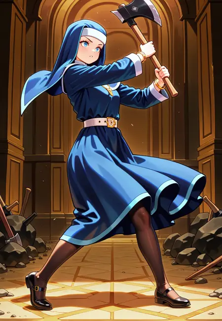 1girl, long blue habit, long blue dress, gold necklace, gold bracelets, blue eyes, white belt, black pump shoes, pantyhose