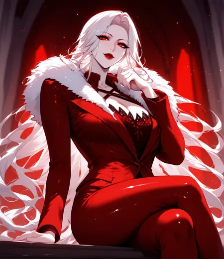 red jacket, red pants, red suit, formal, white fur collar, long fur collar,