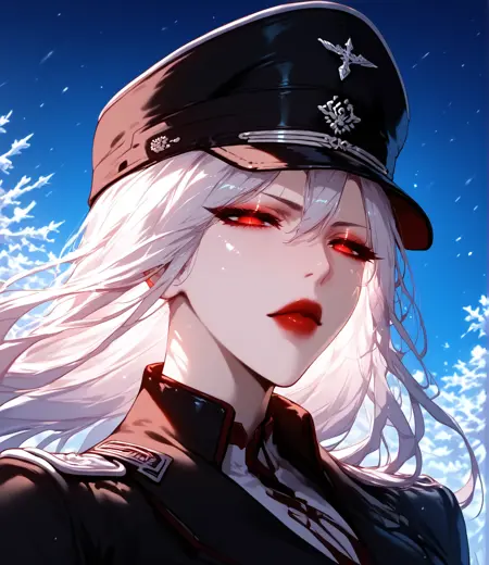 gestella, red eyes, white hair, longhair, very long hair, long eyelashes, eyeshadow, pale skin, forehead, parted bangs,