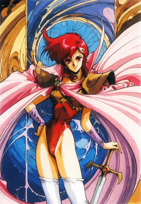 1girl, short red hair, hair ornament, red eyes, red pauldrons, red leotard, pink cape, white thighhighs, beige boots, purple wristbands, collar