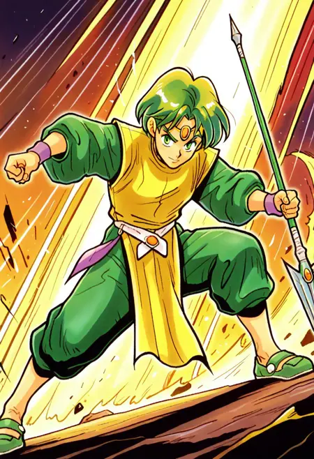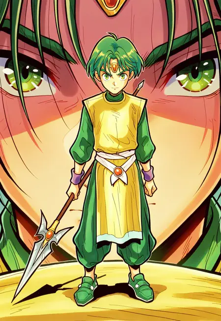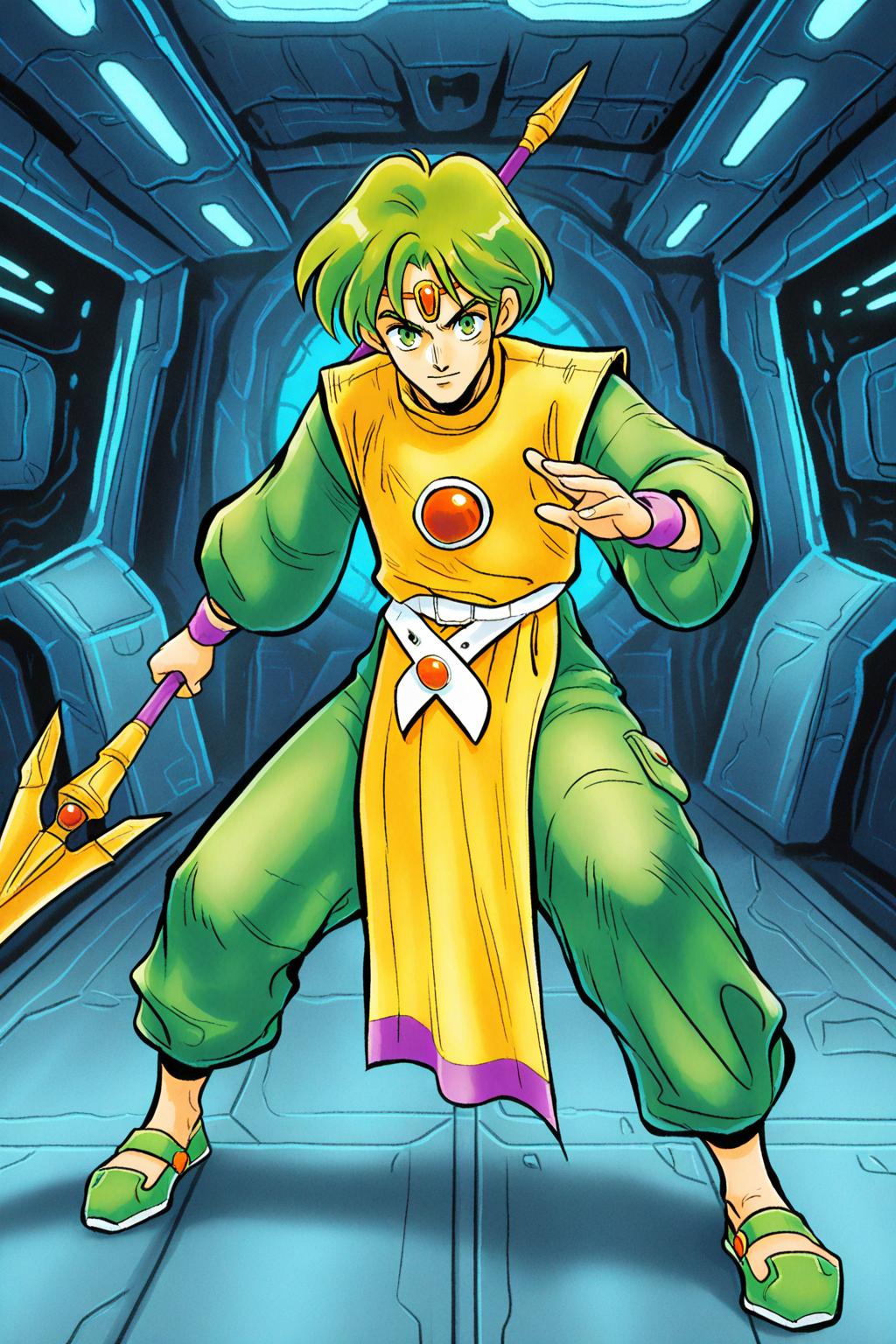 1boy, short green hair, circlet, green eyes, long green pants, long green baggy sleeves, long yellow tabard, purple wristband, white belt, green sandals