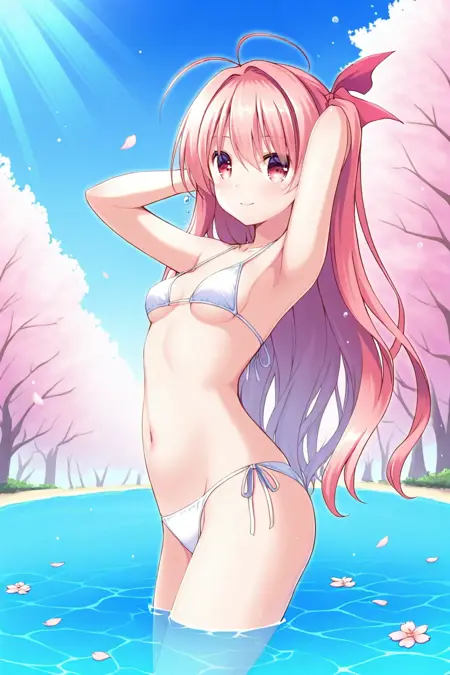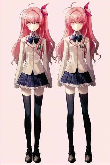 rimi sakihata, long hair, pink hair, pink eyes, school uniform, ribbon, bow, blazer, jacket, skirt, plaid skirt, zettai ryouiki, antenna hair