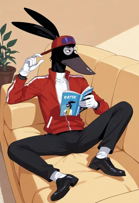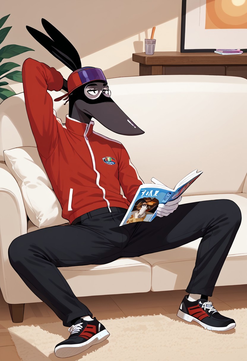 1boy, male, furry, animal, rat, black fur, rat tail, floppy ears, tall, slender, grey nose, big nose, mask marking, face mark, black eyes, white gloves, cap, sun glasses, red jacket, black pants, black shoes