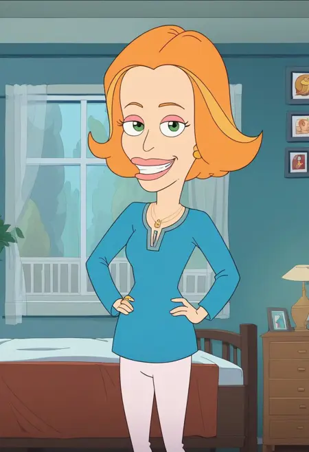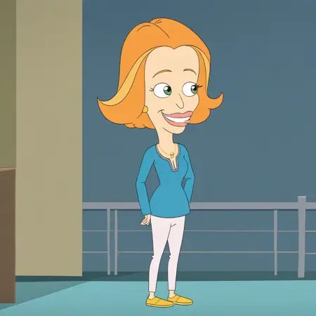Trigger Words: 1girl, Solo, Diane_BM, light skin, green eyes, orange eyebrows, orange hair, short hair, pink lips, pink eyeshadow, blue shirt with v-neck, white skinny jeans, golden earrings, golden ring, golden necklace, yellow flat shoes
