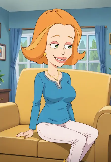 Trigger Words: 1girl, Solo, Diane_BM, light skin, green eyes, orange eyebrows, orange hair, short hair, pink lips, pink eyeshadow, blue shirt with v-neck, white skinny jeans, golden earrings, golden ring, golden necklace, yellow flat shoes