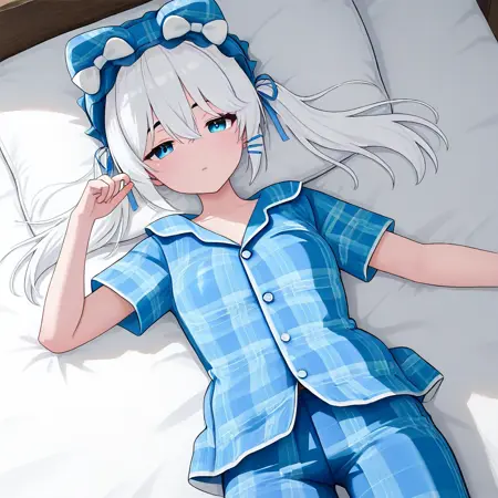 PajamaSegu(パジャマグ): PJMGSG, GSG, 白髪, 長髪, ツインテール, 目の間の髪, 青いリボン, 髪のリボン, 青い目, 青い髪留め, 青いヘアバンド, ボウヘアバンド, 白いボウ, 青いパジャマ, チェック柄の服, 短い袖, 青いズボン