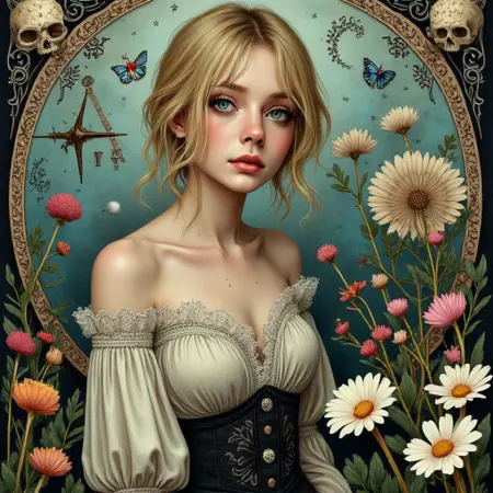 これは、オードリー・カワサキなどのアール・ヌーボーの巨匠への賛辞を loosely に取り入れ、ゴス要素も含んだアートスタイルです。
