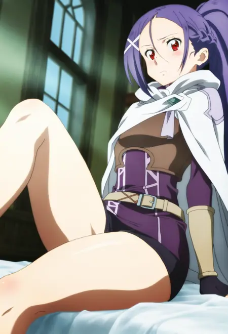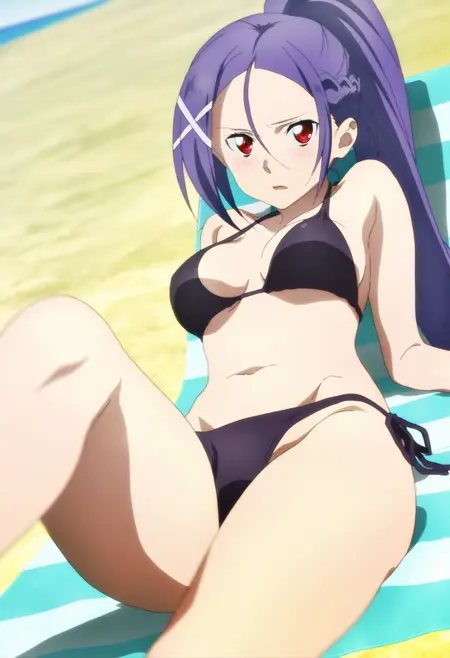 顔の triggerwords: mito face,very long hair, high ponytail, ,french braid,purple hair,red eyes,,forehead, hair between eyes,