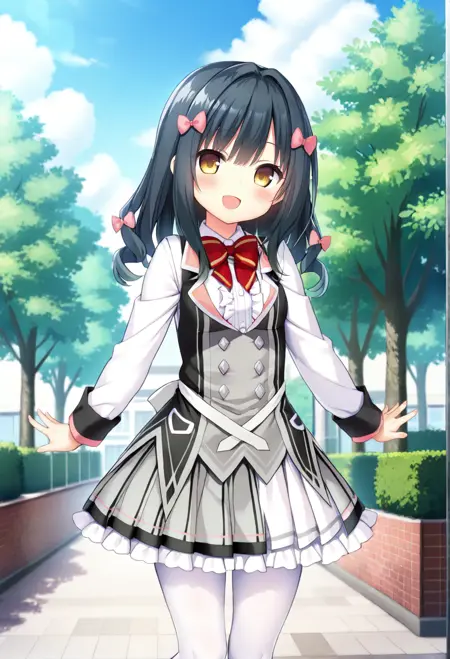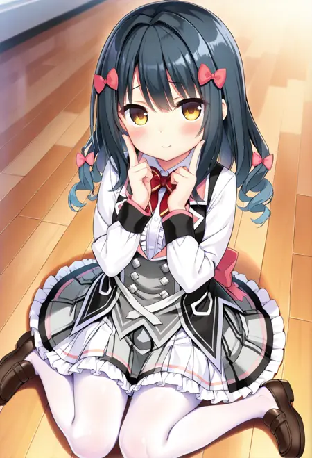 iina-default,yellow eyes,black hair,long hair,hair bow,school uniform,red bow,frilled shirt,frilled skirt,white pantyhose,loafers