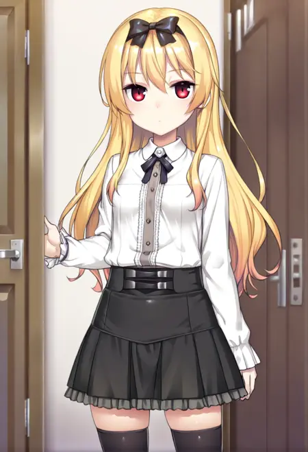yue-default, yue \(arifureta\), 빨간 눈, 금발, 긴 머리, 머리 리본, 흰 코트, 프릴이 있는 셔츠, 프릴이 있는 치마, 검은 치마, 검은 허벅지 양말, 검은 신발