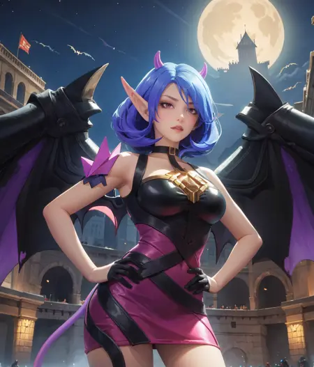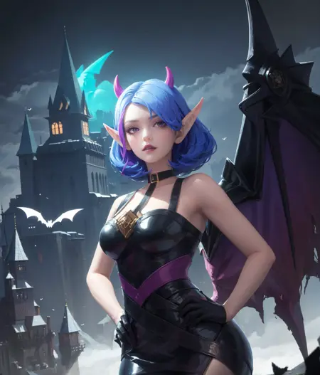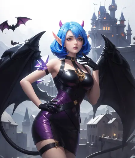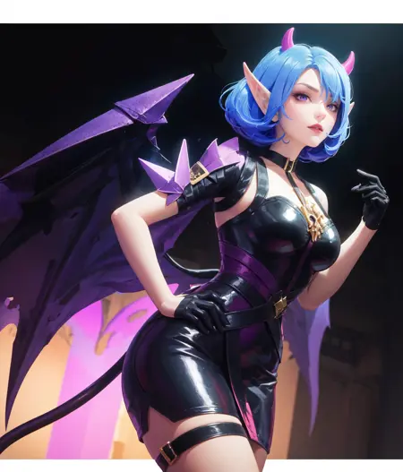 프롬프트:((큰 가슴)), 날개, 1소녀, 혼자, 보는 이를 바라봄, 단발, 큰 가슴, 장갑, 드레스, 중간 크기 가슴, 파란 머리카락, 꼬리, 보라색 머리카락, 뿔, 뾰족한 귀, 허리에 손을 얹음, 허벅지 스트랩, 악마 소녀, 악마 뿔, 악마 꼬리, 악마 날개