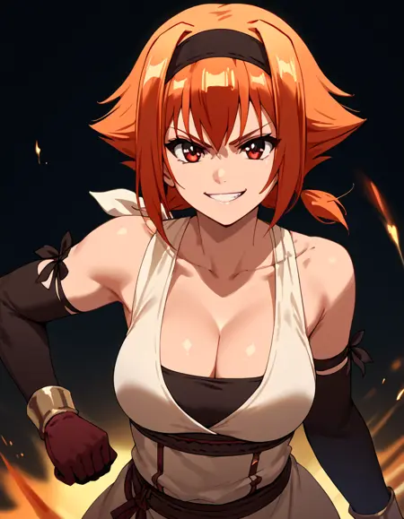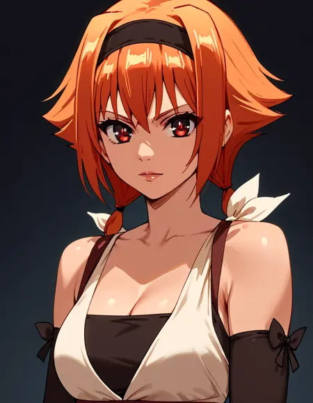 ingrid, red eyes, orange hair, short hair, cleavage, hairband, gloves, elbow gloves,