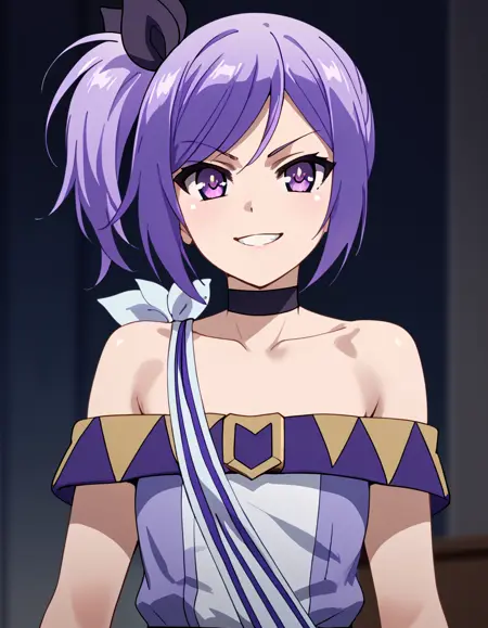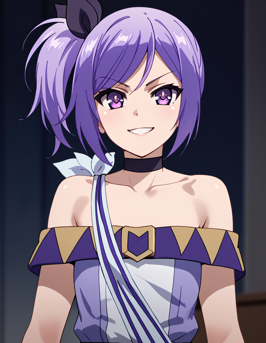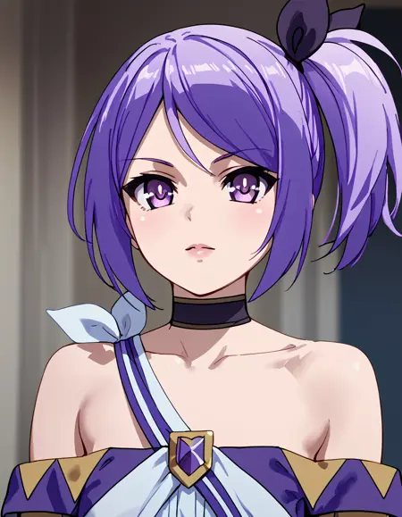 christina, purple eyes, purple hair, short hair, choker, bare shoulders, collarbone, ribbon, side ponytail, hair ribbon, dress,