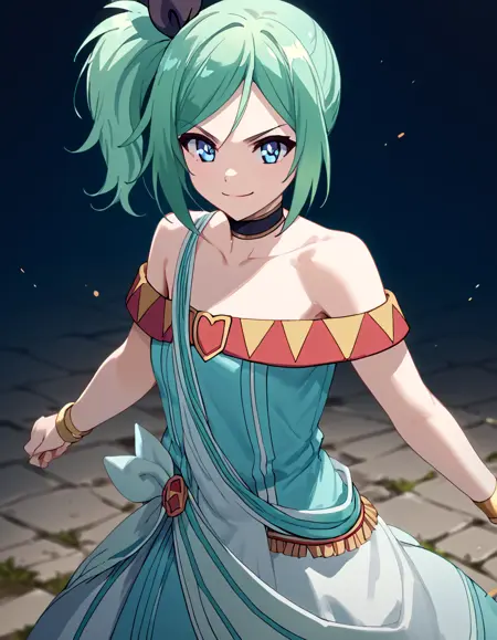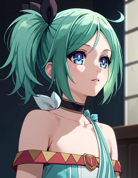 albertina, blue eyes, green hair, side ponytail, choker, bare shoulders, dress, bracelet, jewelry,