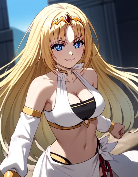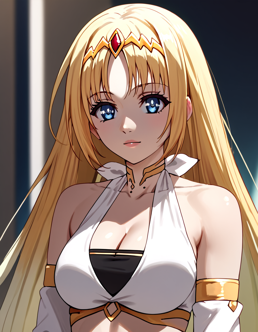 felicia, blue eyes, blonde hair, very long hair, navel, cleavage, midriff, detached sleeves, circlet, jewelry,