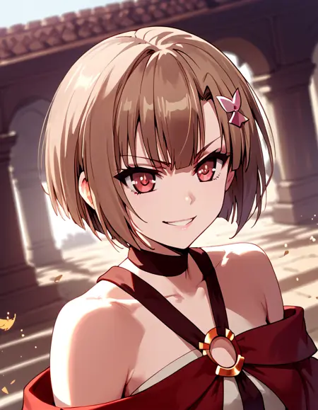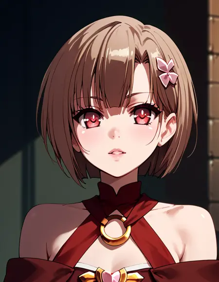 leafa, red eyes, brown hair, short hair, bare shoulders, hair ornament,