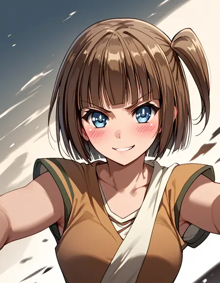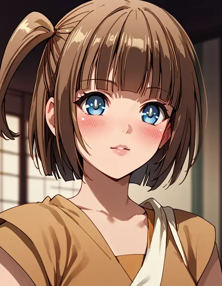 epheria, blue eyes, brown hair, short hair, blush, one side up,