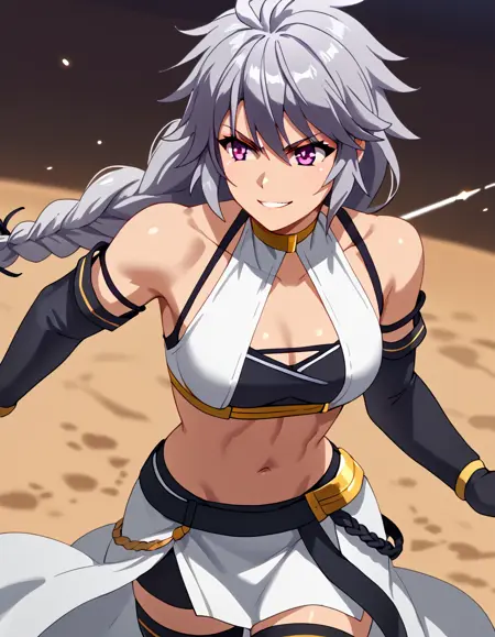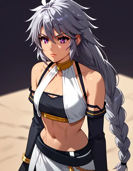 sigrun, purple eyes, grey hair, long hair, single braid, braid, navel, midriff, gloves, elbow gloves, thighhighs,