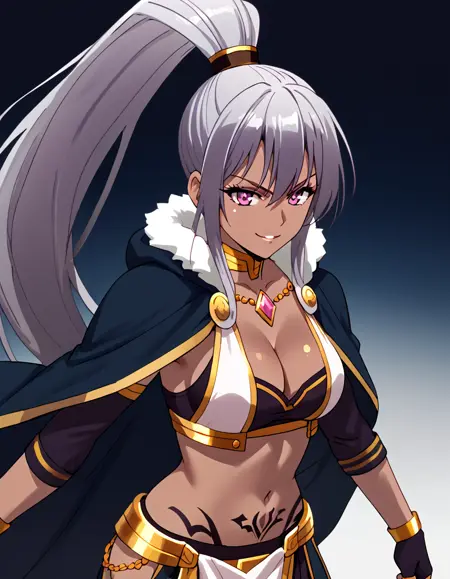 sigyn, purple eyes, grey hair, very long hair, ponytail, mole on breast, tattoo, dark-skinned female, navel, cleavage, jewelry, cape, gloves, fingerless gloves,