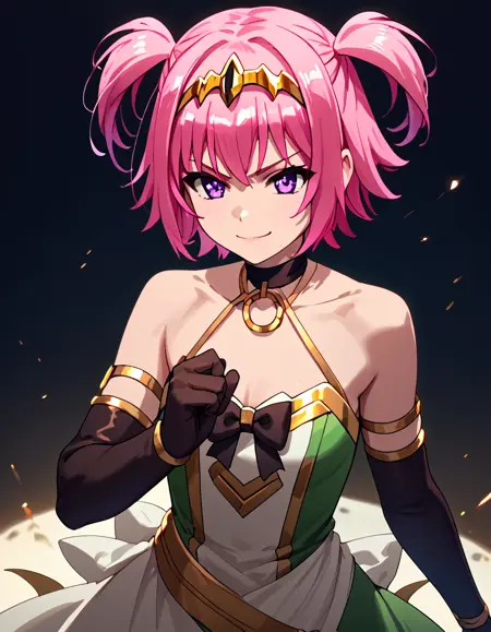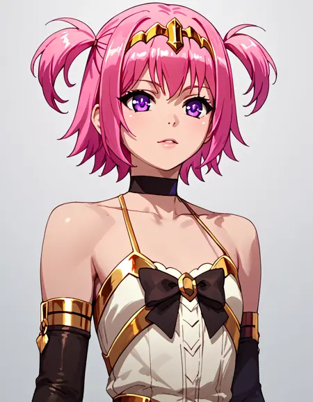 linnea, purple eyes, pink hair, short hair, two side up, choker, black gloves, elbow gloves, bow, dress,