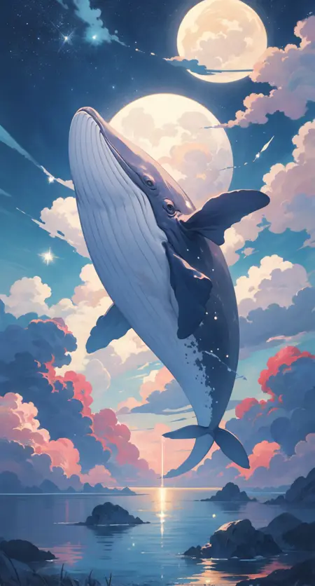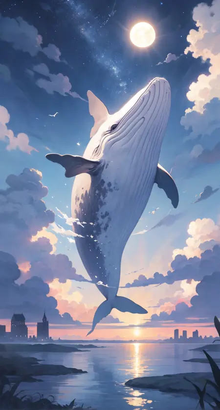 이 모델은 하늘을 나는 고래의 배경을 생성할 수 있습니다. 프롬프트를 변경하면 도시 및 다른 풍경을 아래에 생성할 수 있으며, 가중치를 통해 조정할 수 있습니다.