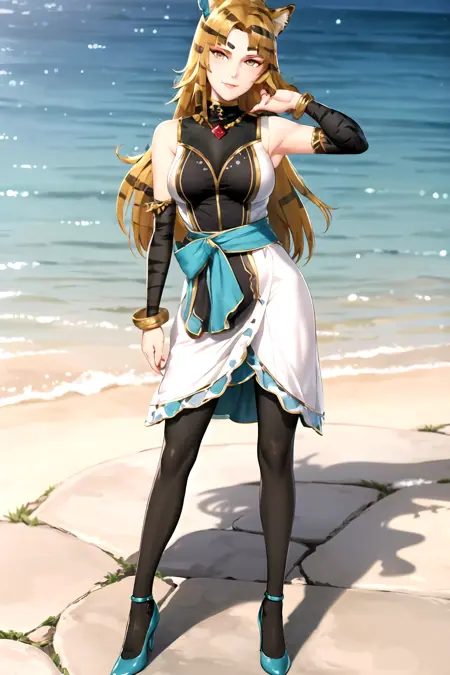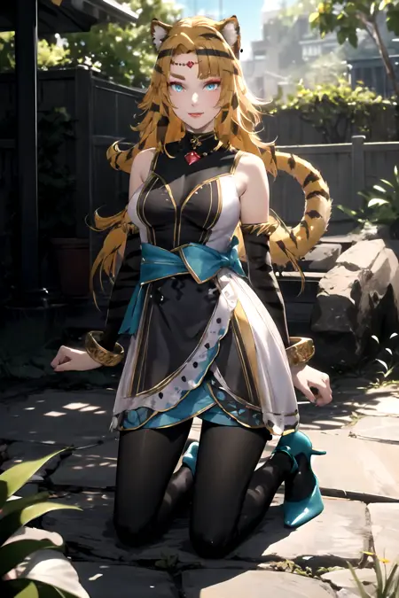 long hair, large breasts, dress, animal ears, tail, pantyhose, detached sleeves, orange hair, black pantyhose, makeup, animal print, eyeshadow, tiger ears, tiger print, tiger tail, forehead jewel, red eyeshadow, tiger girl, cyan high heels