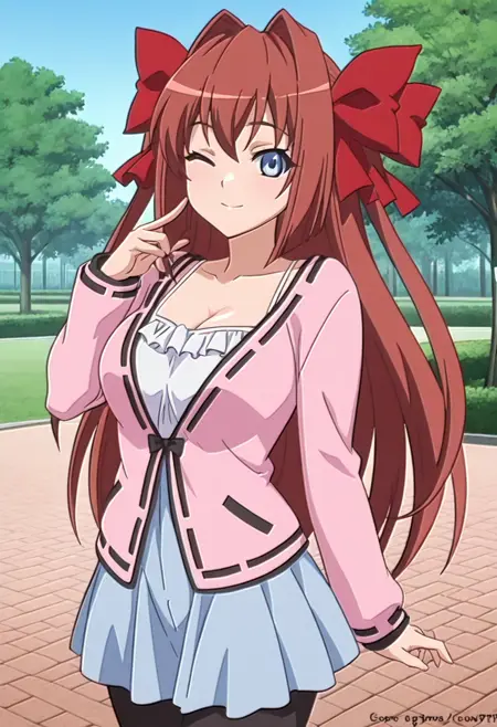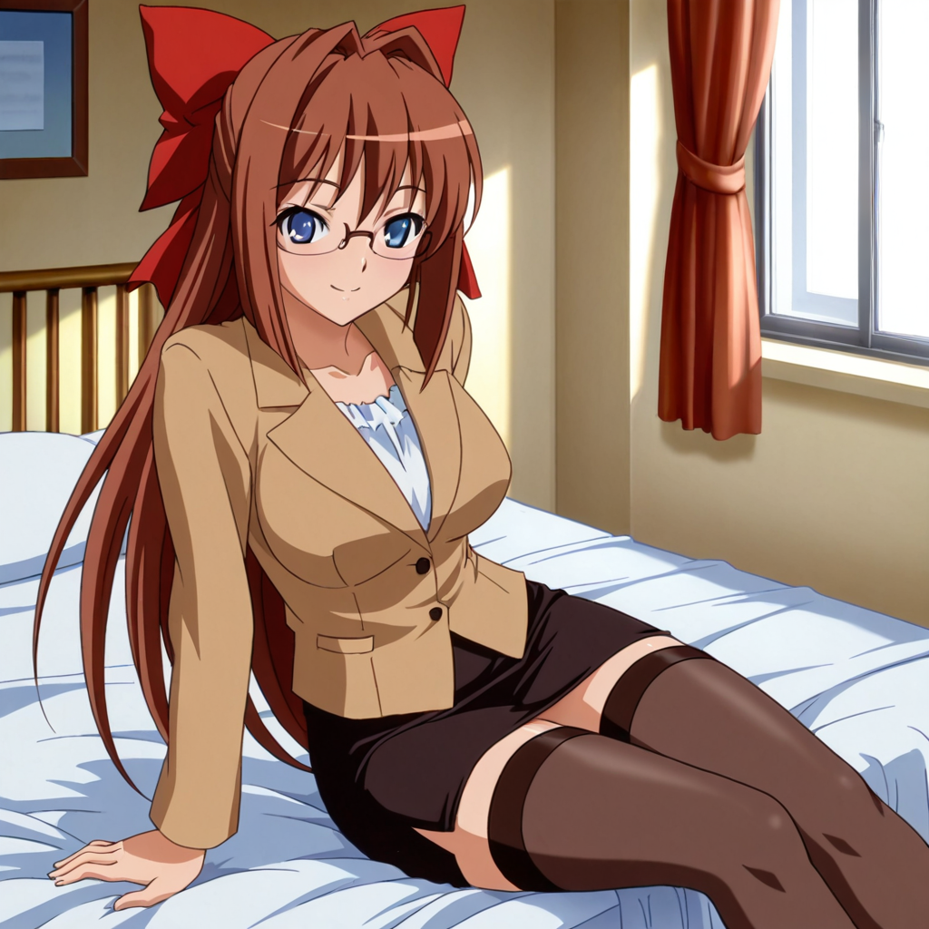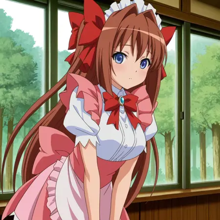 akane, 1girl, 蓝眼睛, 棕色头发, 长发, 红色发带